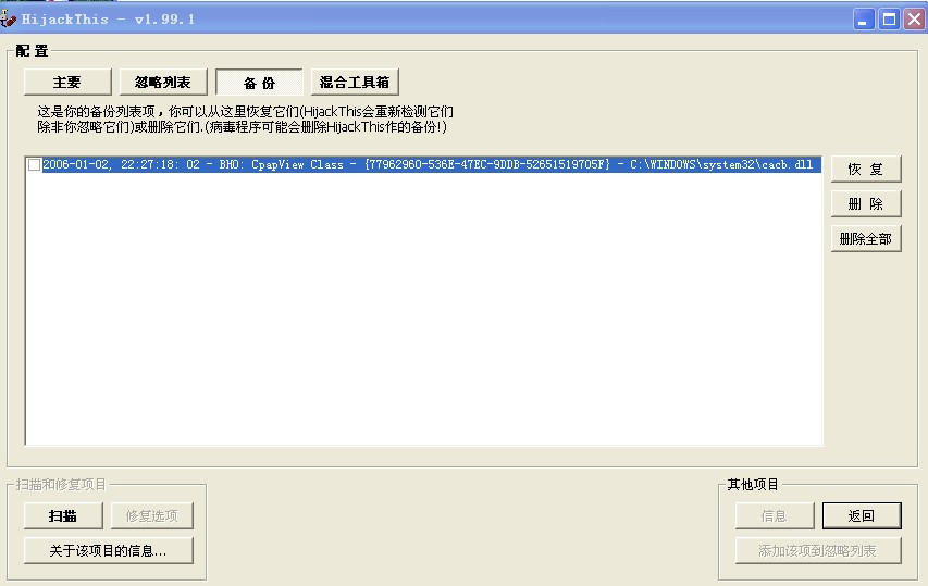 HijackThis 扫描出 BHO: CpapView Class - {77962960-536E-47EC-9DDB-52651519705F} - C:\WINDOWS\system32\cacb.dll这一项,是否还有可疑加载,请大家帮我看一下