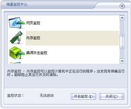 我装完瑞星2006版小雨伞变成黄色的,‘内存无法监控’可是我试了用“工具列表-瑞星监控中心,点击运行-找到内存监控-选择它,按开启监控。“可是监控状态显示:无法启动!右键开启所有监控,仍然提示:下列监控已禁用,内存监控。
