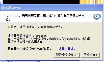 :“RealPlayer遇到问题需要关半闭。我们对些引起的不便表示抱歉。如果您正处于进程当中,信息可能丢失。 请将此问题报告给Micosof t,我们已经创建一个错误报告,您可以将他发送给我们。我们将视为此报告是保密的和匿名的。要查看此报告的包含的数据请单击此处。”