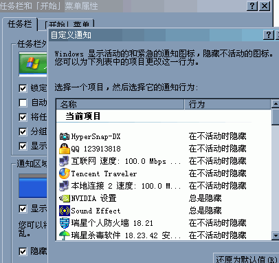 我用的是XP-SP2的系统,现在用了几个小软件,最小化以后就像QQ一样自动隐藏在任务栏里了,但我在运行别的程序的时候任务栏里几个小图标突然消失了,打开任务管理器后在进程是选项里能看到这几个程序运行的好好的,但是在任务栏里最小化的那个图标没了,原来也出现过类似的问题,我只能重新启动,然后重新运行这几个软件,请问我现在怎么才能不重新启动机器把这几个程序的图标显示出来?谢谢了