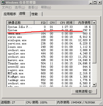 我的电脑只要一开应用程序,速度就会变得很慢,比如打开WINdvd,就会明显发现鼠标移动不流畅,查看任务管理器时,总是有一个叫system的进程,占用CPU都在90%左右,有时甚至高达99%,只要一关掉打开的这个应用程序,system进程的cpu占用马上变为零。当你打开另一个应用程序时,相同的情况发生了。这到底是怎么回事?