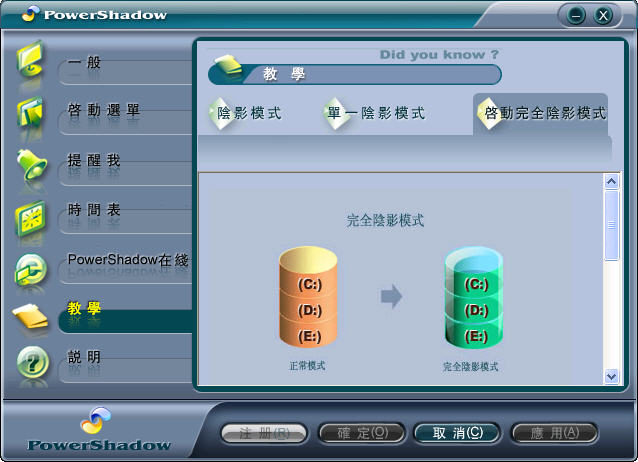影子系统--PowerShadow--它是你电脑的分身,是你另一部电脑,它不会存有任何你在此模式的任何资料但可以用齐你主机有的所有功能。放心吧,在此模式中毒,只要离开再进入即没问题!!最适合测试新软件!!