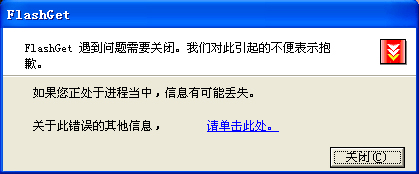 我的FlashGet是最新的1.71免费版的,系统为WIN XP SP2,以前一直用得很好,最近出问题了,一打开,就出现一个错误对话框(见附图)请教各位大侠,如何解决?谢谢!