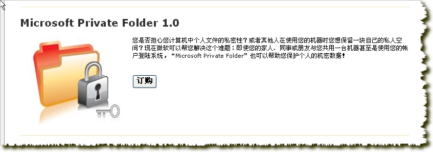 您是否担心您计算机中个人文件的私密性?或者其他人在使用您的机器时您想保留一块自己的私人空间?现在微软可以帮您解决这个难题:即使您的家人、同事或朋友与您共用一台机器甚至是使用您的帐户登陆系统,“Microsoft Private Folder”也可以帮助您保护个人的机密数据!
