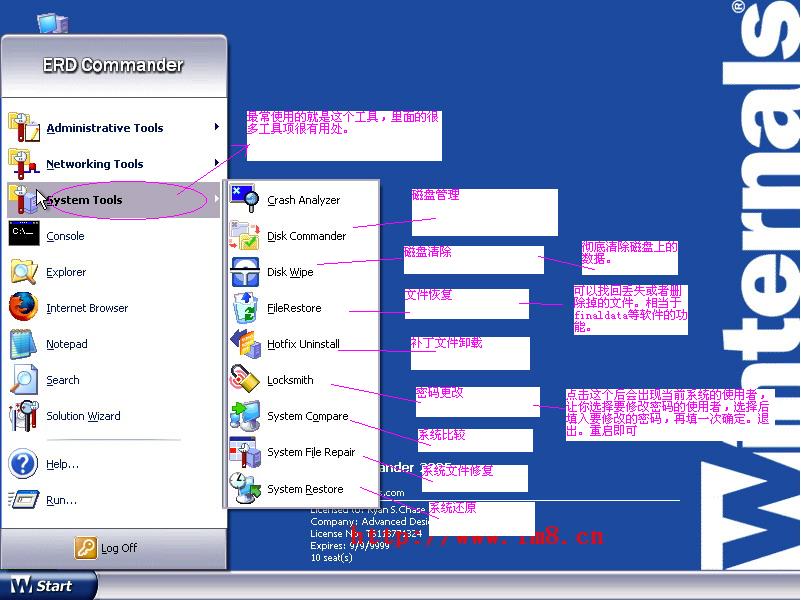 你的是汉化版还是英语版?插入光驱,设置biose为第一启动项。然后重新启动电脑,自动进入该软件界面,等待一会后,问你是否加载网络支持,点是或者否都行,一般点否。然后进入后如果是汉化版自己看吧,可以系统还原,可以更改系统密码,可以修复系统文件,可以抢救系统里的文件等等。