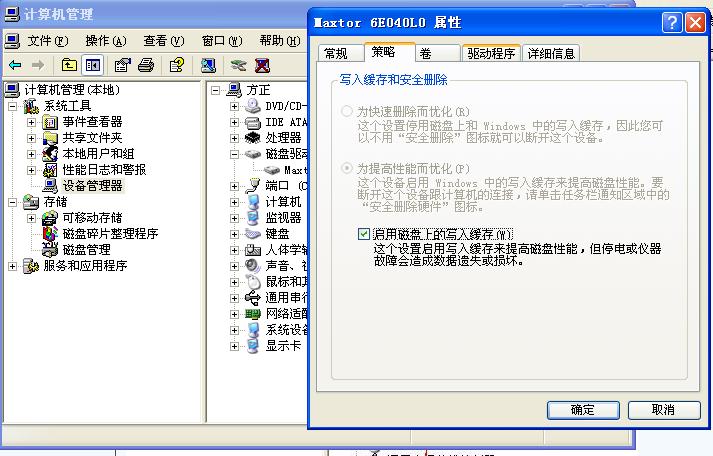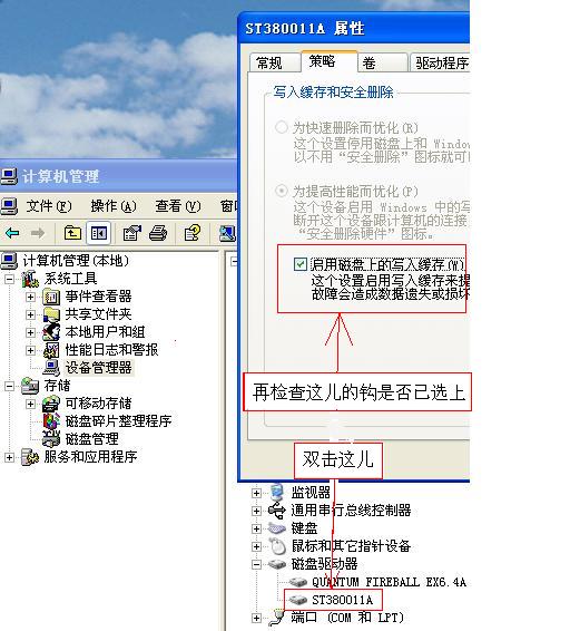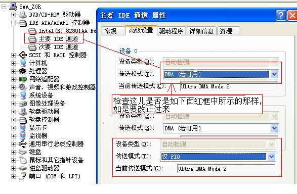 鼠标指到“我的电脑”→击右键再→“管理”→“设备管理”→在右面找到“你的主盘型号”双击它如下图所示: