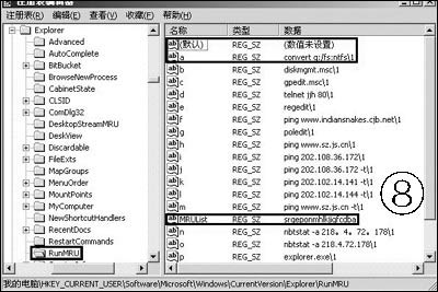 使用Windows操作系统的“开始/运行”命令时,我们会发现它的“打开”框中有许多命令,这些命令并不是我们都需要的,而有些信息也容易暴露个人信息。如果要删除此处的垃圾信息,请在注册表编辑器中,依次展开“HKEY-CURRENT-USER/ Software/Microsoft/Windows/CurrentVersion/Explorer/RunMRU”。在该注册表的右侧显示出“运行”下拉列表中的信息,要删除某个项目,用鼠标右击名称,选择“删除”即可,注意不要删除“默认”和“MRUList”所在的行(如图8)。