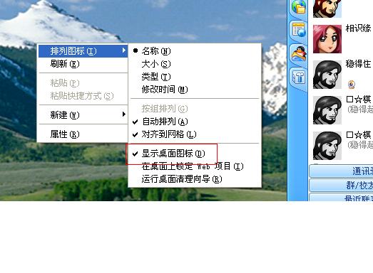 鼠标指到→“桌面”→右键→ 看图所示选择红框即可显示桌面图标