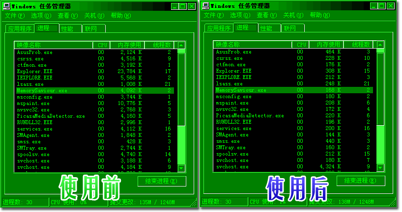 "内存救星"会把那些"不常用",但是"必须运行的程序"的内存使用量降到最低,这和传统的"内存整理"是完全不同的!您会有更多空闲内存来运行其它程序,速度会更快。