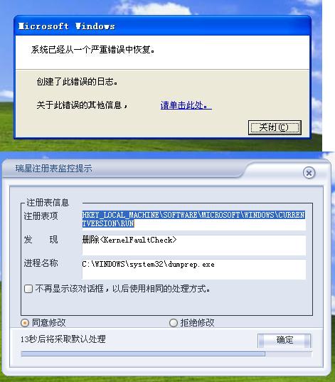 不知道怎么了今天一开电脑又出现了以前的情况/图1开机后说出现错误,我不知道是什么错误,然后瑞星就出现对话框询问是否修改~~