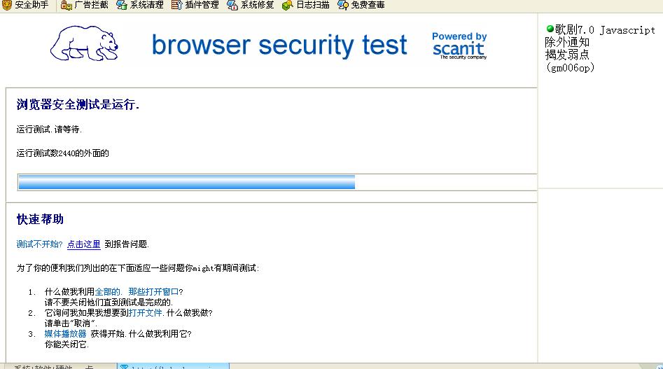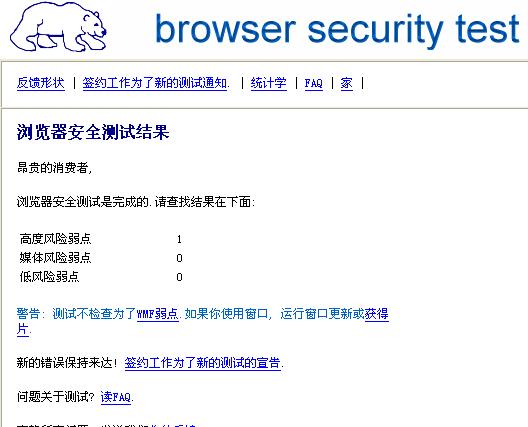 进入“http://bcheck.scanit.be/bcheck/”打开测试浏览器是否安全的网站,只要打开这个页面,网站程序会自动检测出你的浏览器类型,页面中有两个选项,Ouly test for bugs specific to my type of browser(仅测试浏览器的BUG)和Run all available tests(所有可行的检测)在此建议选择第二项,然后单击“Start thetest”链接即可开始检测你的浏览器了,只要等几分钟程序会给出这次检测报告。一般会有三个等级:High Risk vulnerabilires(高危漏洞),Mcdium Risk vulnerabilires(中级危险漏洞)和Low Risk vulnerabilires(低级危险漏洞)并且给出各级别漏洞个数。紧接着页面后面就给出检查出的所有漏洞的描述及相应的解决方案,让你知道该漏洞的原理及解决漏洞的方法,只要按照网页上面的提示信息进行操作即可。