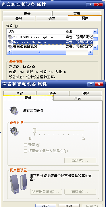 我的音频设备不出声,我在“声音和音频设备”属性的“硬件”选项卡里看是“这个设备运转正常”,可在“音量”选项卡里看是“没有音频设备”,而且右下角没有那个喇叭,这是怎么回事呀?