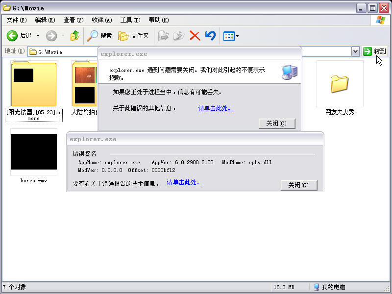 刚做的系统,感觉都很好,但用了二天后就出现一个问题,就是在打开放电影的文件夹报错,只要打开就报错,除了这个文件夹以外开什么都没有问题,问一下这到底是怎么回事,急死人了,请看图: