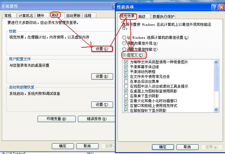 鼠标指到→“我的电脑”击右键→“属性”→ “高级”→ “设置”如图所示