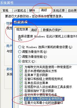 我的电脑---属性--高级---性能---设置---视觉效果--在桌面上为图标标签使用阴影