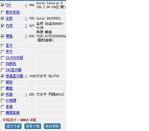 朋友配置了一台电脑(今天配的),花了5000大洋。配置如下:CPU:赛D2.8;内存是金邦512MDDR400;光驱SONYQ120A; 显卡 微星X550CF;鼠标键盘 大水牛光电套件;主板 INTEL 915PDT;硬盘 ST160G/IDE7200.9;显示器 大水牛1704无点;机箱 大水牛0412; 天敏1394卡
