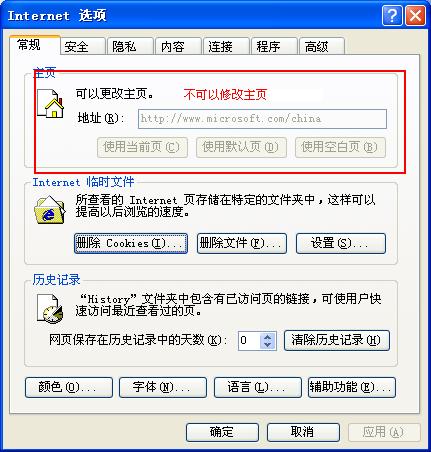 最后到这HKEY_CURRENT_USER\Software\Policies\Microsoft\Internet Explorer\Control Panel新建一个homepage的DWORD值设置为“1”锁定IE主页。锁定后就成为下面这样