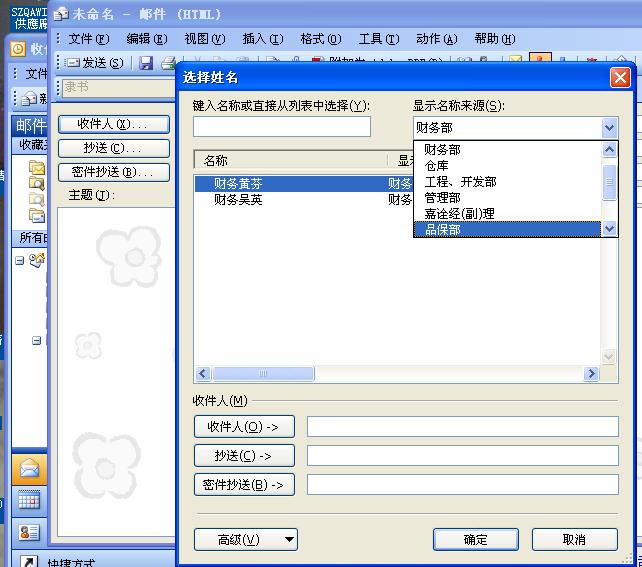 我昨天用outlook都很好用,但今天一用却出现一个问题。即打开新建邮件,点击收件人,只可以用前面的,需要在下拉菜单中选择就出现另一个对话框,附二个图。