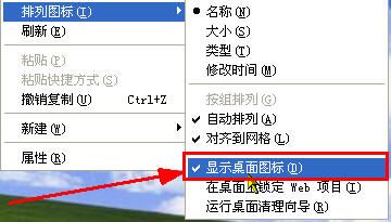 试试在桌面空白处击右键选择菜单→排列图标→在显示桌面图标的选项上打钩钩→参见下图所示