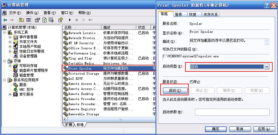 我的电脑右键--管理--服务和应用程序--服务 找到print Spooler启动服务并设置为自动。确定。