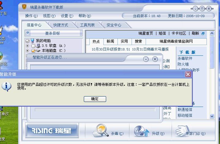因为这几天瑞星老被病毒给屏掉,所以卸装了好几次,可是今天想要升及却这样了,大家有啥哈的办法能让它升及吗,大家帮帮忙啊谢了啊