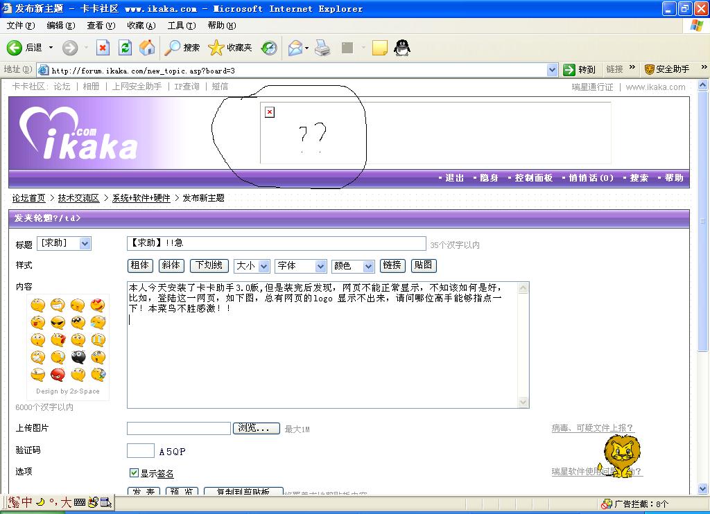 本人今天安装了卡卡助手3.0版,但是装完后发现,网页不能正常显示,不知该如何是好,比如,登陆这一网页,如下图,总有网页的logo 显示不出来,请问哪位高手能够指点一下!本菜鸟不胜感激!!