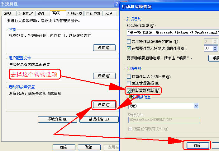 试试鼠标指到“我的电脑”击右键→“属性”→“高级”→系统启动,系统失败和调试信息→“设置”→参见下图红框所示→