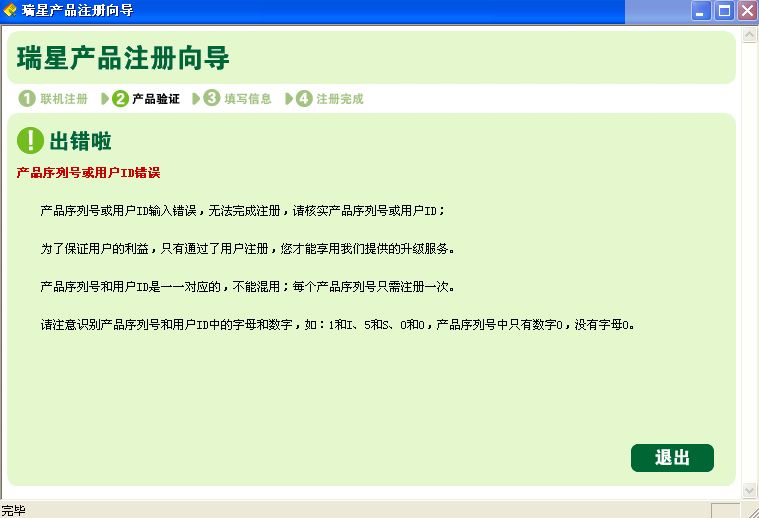 你要认真的输入你的ID号,前一个序列号是正确的。因为要是不正确,你也就不能安装瑞星杀毒软件。而ID号,可能不正确。原因,瑞星安装时只是识别前几位的ID号,而后几位出错了也能够安装。所以建议你重新输入正确的ID号。其中都要大小写分清,字母O和数字0之间的区分。