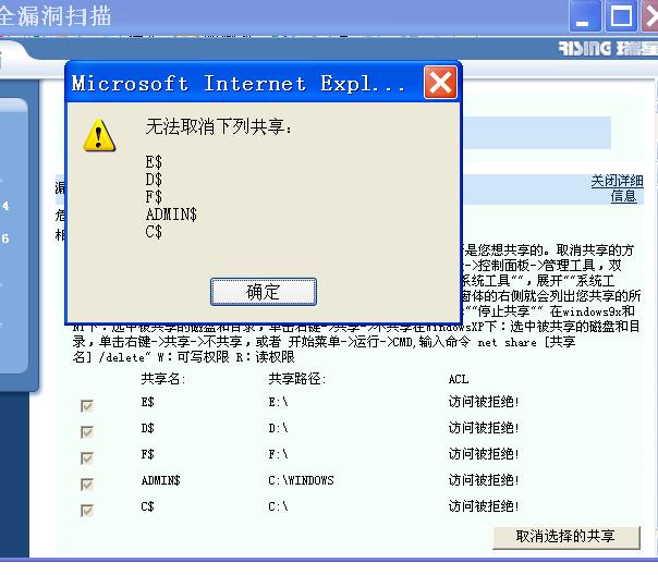 【学习的诚者2的贴子】今天用瑞星的漏洞扫描,提示我有几个地方被共享,按瑞星中的“取消此共享”则会提示“访问被拒绝”,而按照瑞星的提示又不懂。 ……………… |