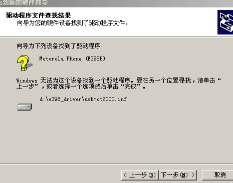 我的手机和电脑连接不上,就无法用MotoMidMan_v0.37往手机上装java程序,以前装过,后来系统重装了,现在怎么也装不上,我的电脑用的是win2000 service pack 4操作系统,在网站下载了e398的驱动,但是指定那个文件夹,提示好像找不到需要的文件,总是不成功,我用优化大师把硬件卸了,再装,还是如此。请高手指点,再现急等!!