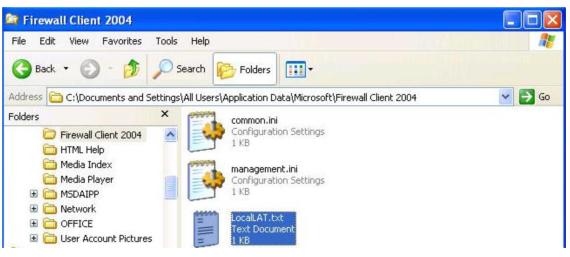 打开C:\Documents and Settings\All Users\Application Data\Microsoft\Firewall Client 2004目录,新建一个文本文件,名为LocalLAT.txt;