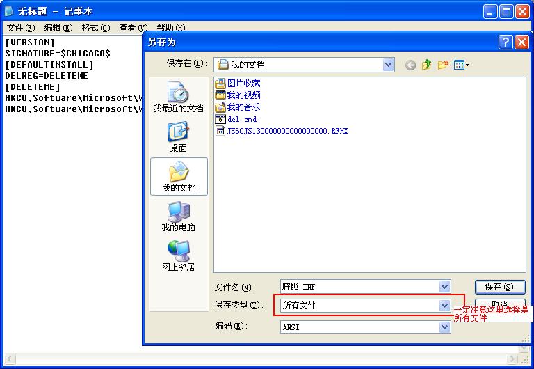 你那是文本文件,不是INF文件。保存时选择所有文件,然后保存为:“解锁.INF”