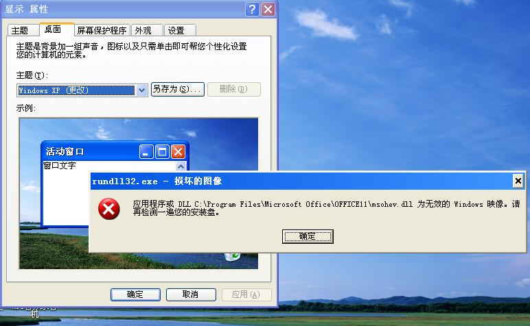 我的电脑在桌面上点右键属性再点桌面选项时弹出奇怪的错误提示如图;要连续点击同样的错误提示四次后可打开桌面选项,而且看错误提示应该是office的错误,但我的office却可以正常打开,最近只用过兔子清理过系统.请大家帮忙看怎么解决??
