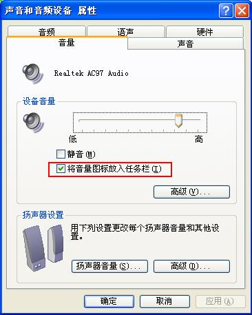 控制面板--声音、语音和音频设备--声音和音频设备--在将音量图标放入任务栏,那里打上勾。确定。