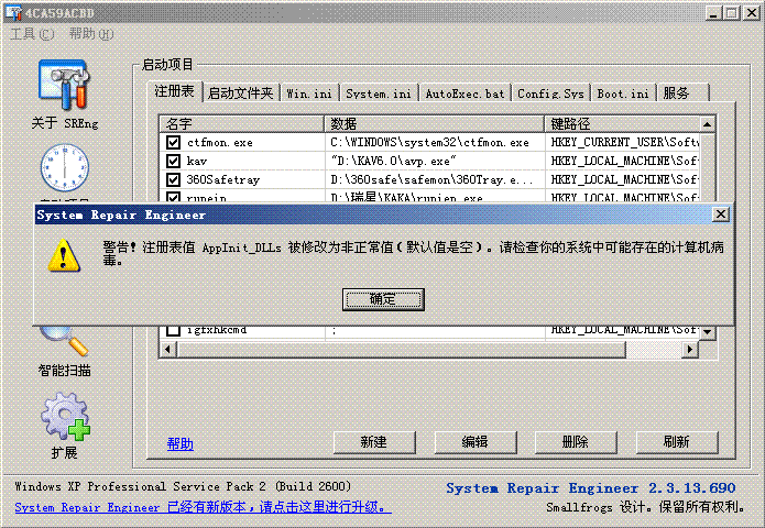 根据你提供的那图片上的内容是说AppInit_DLLs被修改为非正常值(默认值是空)你就在注册表中的下面那个位置“我的电脑\HKEY_LOCAL_MACHINE\SOFTWARE\Microsoft\Windows NT\CurrentVersion\IniFileMapping\win.ini\Windows”在右面找到“AppInit_DLLs”双击它看看它的值是否是:“SYS:Microsoft\Windows NT\CurrentVersion\Windows”如果不是就修改为“SYS:Microsoft\Windows NT\CurrentVersion\Windows”这是我的判断不知道是否正确?你就试试看看能否解决问题?