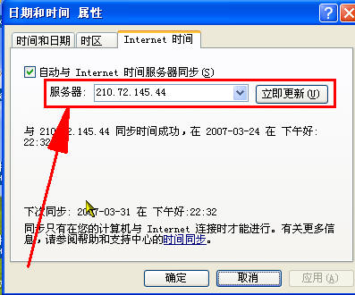 双击系统栏里的时间项,选择“internet时间”时间标签,在服务器栏中填入“210.72.145.44”参见下图片