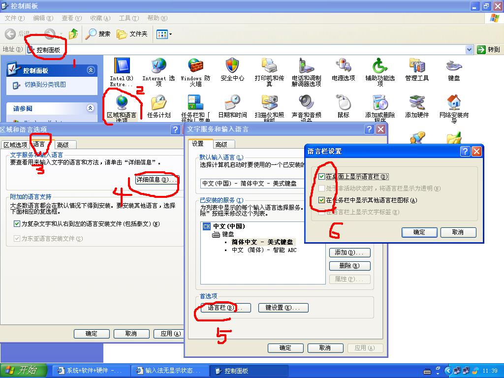 我系统是XP的,我刚才按照你的回复,照做了,到第5步文字服务和输入语言选项卡时,下面的首选项 语言栏 按钮不可用,进不了语言栏设置~