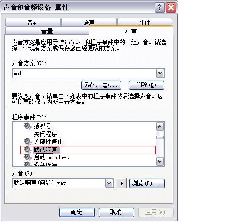 通过浏览选一个自己想要的声音,然后点应用,确定后退出!