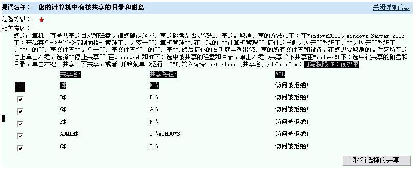 | 引用: | 【darkangel925的贴子】我上网是通过公寓局域网,经常会受到别人的恶意攻击,前几天买的瑞星2007组合。安装完后进行系统漏洞扫描,出现了 “您的计算机中有被共享的目录和磁盘” 修复后每次重起都有这个漏洞,请问是什么问题?我该怎么办?是不是有人强行把我的磁盘共享了?在这期间我丢失了2个游戏帐号~~