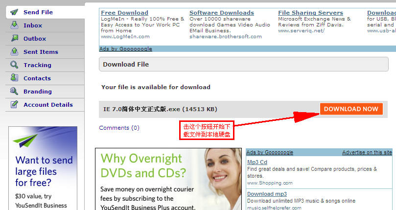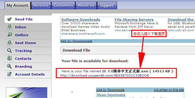 ③登录刚才在Recipient email(s)项中(你的收件邮箱地址)的邮箱,这时会收到由“youSendit”网站发来的邮件,打开它击其中的