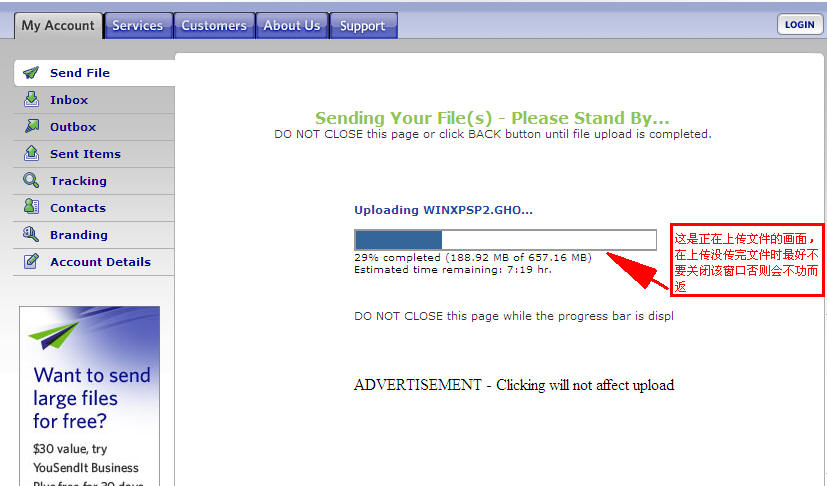 一般的邮箱都限止附件的容量要发送超大附件可按下面的方法:到这http://www.yousendit.com/个网址