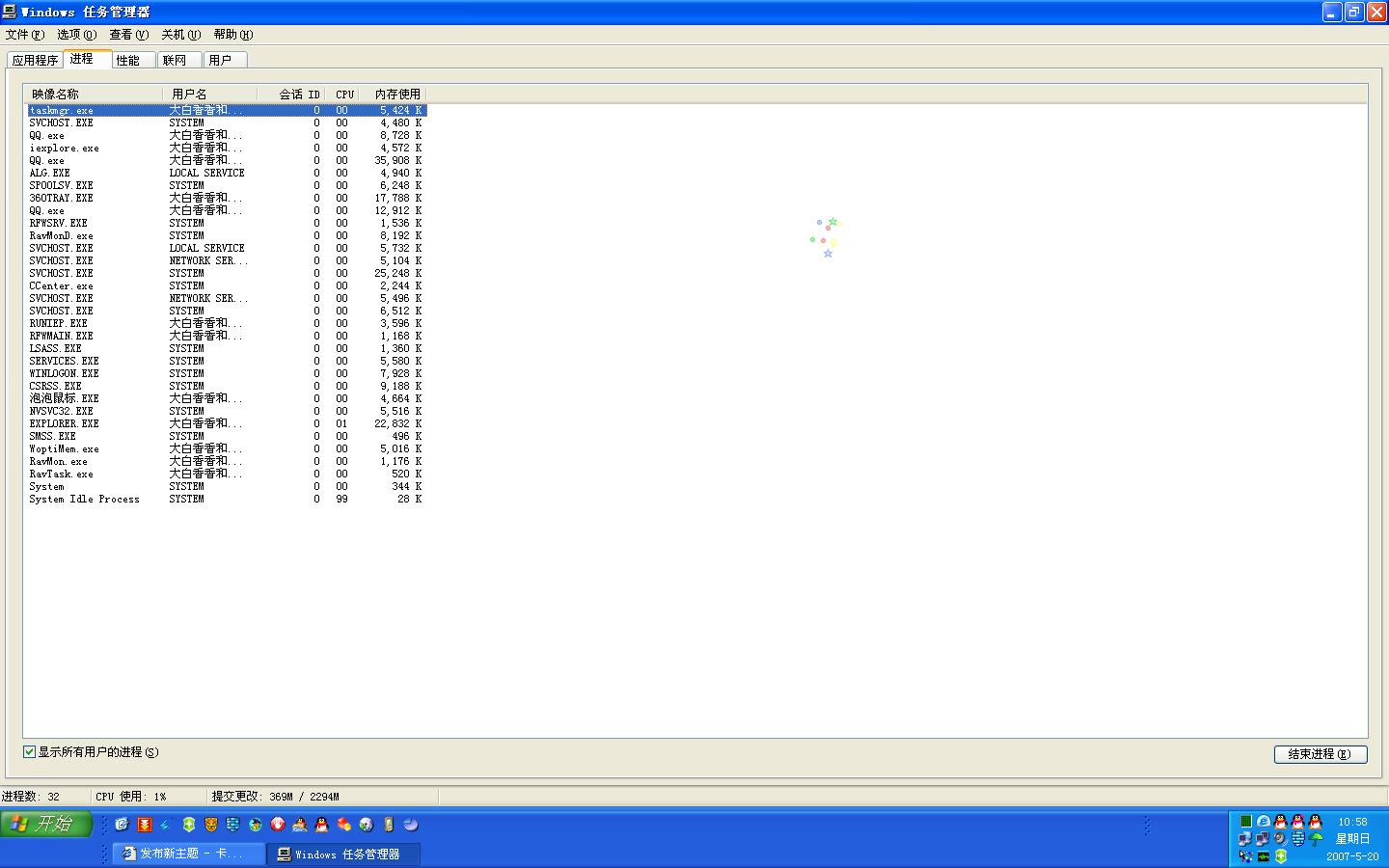查看系统进程。也有好多不知道是什么的。而且在我结束了它的进程后也没有任何程序被关闭,请问是不是中了木马之类的东西啊?(我是在开了网络快车和迅雷下载东西的情况下抓的图。同时打开的还有优化大师的一个内存整理工具和一个鼠标优化工具,同时开了3个QQ。瑞星杀毒。防火墙。卡卡。360安全卫士)
