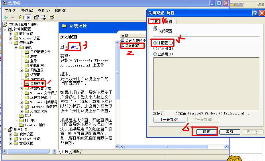 2、组策略中“系统还原”--“关闭配置”设置为“已启用”。此情况下,开始--运行--输入“GPEDIT.MSC”--回车,然后按照下图顺序将配置做如下更改更改即可: