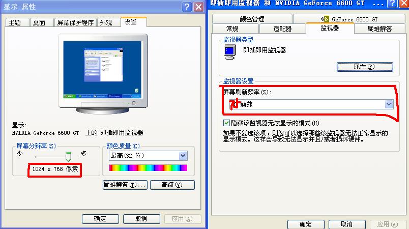提高屏幕分辨率为1024*768或以上!屏幕刷新频率提高到75Hz或以上!只要不是显示器或显卡太烂!(见下图)