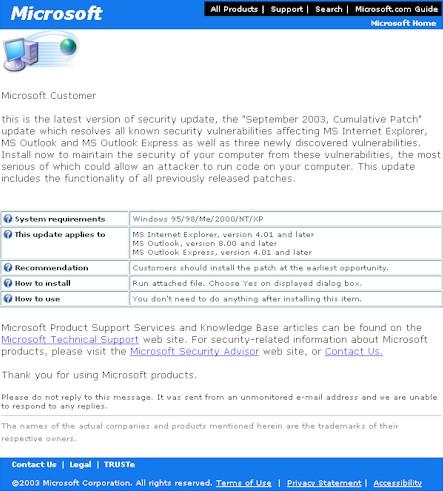 通常如果Microsoft发布了安全通告,都会用email的方式通知订阅了提醒服务的用户。然而,经查有很多怀有恶意的人用哄骗的方法伪造微软的安全公告邮件。其中有些邮件还会欺骗收件人连接到某些网站去下载恶意的程序,或者邮件本身就含有一些病毒作为附件。