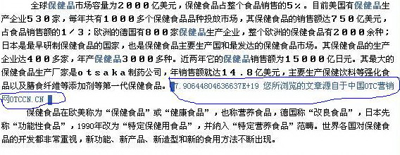 随着社会进步和经济发展,人类对自身的健康日益关注。90年代以来,全球居民的健康消费逐年攀升,对营养保健品的需求十分旺盛。在按国际标准划分的15类国际化产业中,医药保健是世界贸易增长最快的五个行业之一保健食品的销售额每年以13%的速度增长。2005年,全球保健食品的销量将超过600亿美元,2010年时,该值会接近1000亿美元。 5* vRn\"a+X,9*ji您所浏览的5* vRn\"a+X,9*ji文章5* vRn\"a+X,9*ji源自于5* vRn\"a+X,9*ji中国OTC营销网! 中国OTC营销网 医内医药行业最主流的营销平台1.90818415747748E+19 您所浏览的文章源自于中国OTC营销网OTCCN.CN