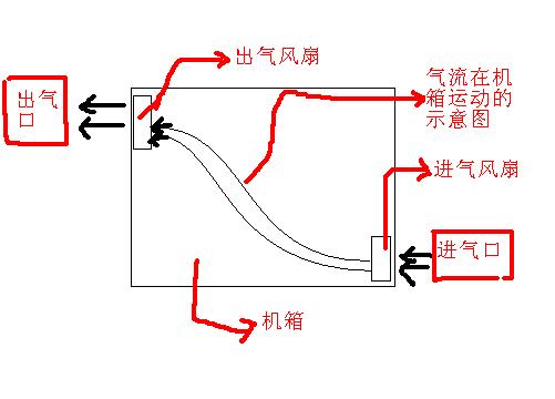 如果机箱有进气孔没进气风扇的话搞个进气风扇(一般只有排气风扇),效果会好很多,缺点是机箱内部很容易脏,而且会增加耗电量,电源功率小于300W的就算了(如下图,自绘的);