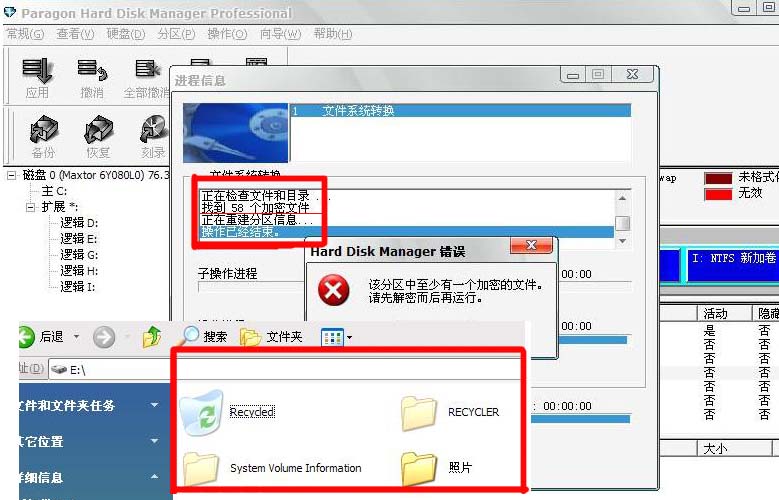 E盘里的一些图片不见了,想将格式转换为FAT32再进行数据恢复,希望能找回丢失的照片,操作如下图,每次都提示有加密文件,先解密。