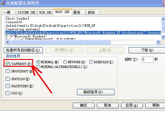 在“开始菜单”→“运行”→输入“msconfig”回车→进入“系统配置实用程序”→击“boot.ini”卡找到“SAFEBOOT(F)”项并打上钩即可。在启动时就可进入安全模式了,在要还原回到正常模式下记住就要去掉这个钩钩哦。→参见下图片所示